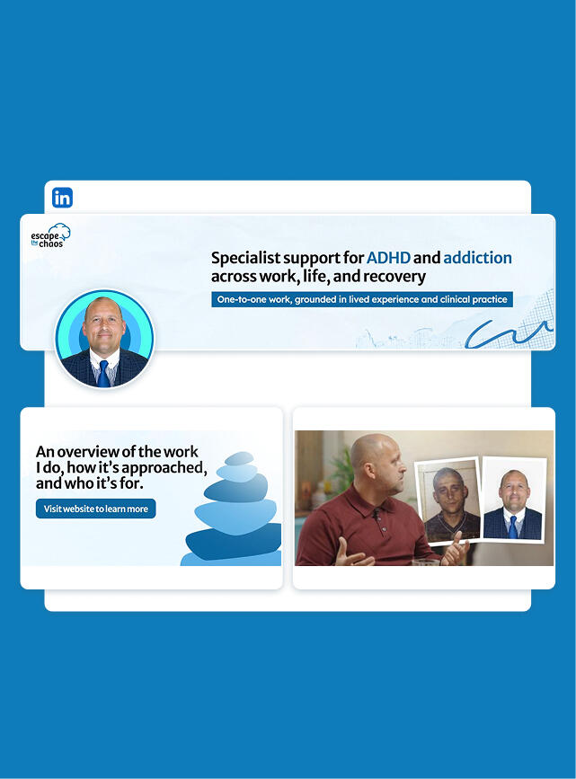 The starting point was creating a brand.This was where Escape the Chaos became the identity of the business, rather than simply a phrase or concept connected to his work. A visual identity was created that gave the business a recognisable and consistent presence across LinkedIn, his website, and every public-facing touchpoint.Alongside this, the deeper work involved restructuring how his services were presented. At the time, his support existed across multiple offers, which made it harder for someone to understand how to engage with him and what the journey involved.Danny stepped back and mapped the Escape the Chaos 12-week programme in full. This meant working through how the programme would unfold week by week, what each stage would focus on, how clients would be supported throughout, what was included, and how to communicate the value of that process in a way that made sense to someone genuinely considering it.Instead of a collection of separate services, there was now a clearly defined flagship programme at the centre of the business.Once the programme was in place, his LinkedIn profile, website, and landing page were rebuilt around it, so that everything someone encountered pointed toward the same clear offer and the same clear outcome. Every part of his presence now told the same story.As this took shape, people began booking and paying for the programme. The structure made it easier for people to understand what they were committing to, and it allowed James to present his work with clarity and confidence. He was no longer trying to explain several different things at once. He was presenting something defined, something with substance behind it.That clarity extended beyond LinkedIn. He began delivering talks, exhibiting at events, and building relationships with credible people in the ADHD and addiction space. Escape the Chaos had become a recognisable brand.