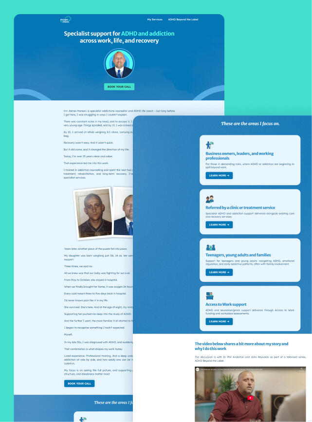 At that point, there was no defined brand behind the business.There was no visual identity that tied everything together, no recognisable presence, and nothing that reflected the calibre of the work he was doing.His services had developed over time in response to the needs of the people he helped. He offered ADHD coaching, addiction counselling, and one-to-one support, but these existed as separate pieces rather than as part of a clearly structured whole. From his perspective, this was natural. He was simply helping people. But from the outside, it created friction.There was no single, clear starting point for someone considering working with him, and no defined journey that helped them understand what that process would look like. This made it harder for the right people to commit, because they could not easily see where they fit or what the path ahead involved.At the same time, he was investing energy into LinkedIn. He was sharing parts of his story, and in particular a specific part of his personal journey that drew attention quickly. Initially, this worked. But over time, that small window into his story began to carry less weight. It created visibility, but it did not reflect the full depth of his work or his experience.When your work is deeply personal, and when you know the value it brings, it is difficult not to question yourself when that traction slows. But this was not a reflection of his ability. It was a reflection of how his work was positioned.